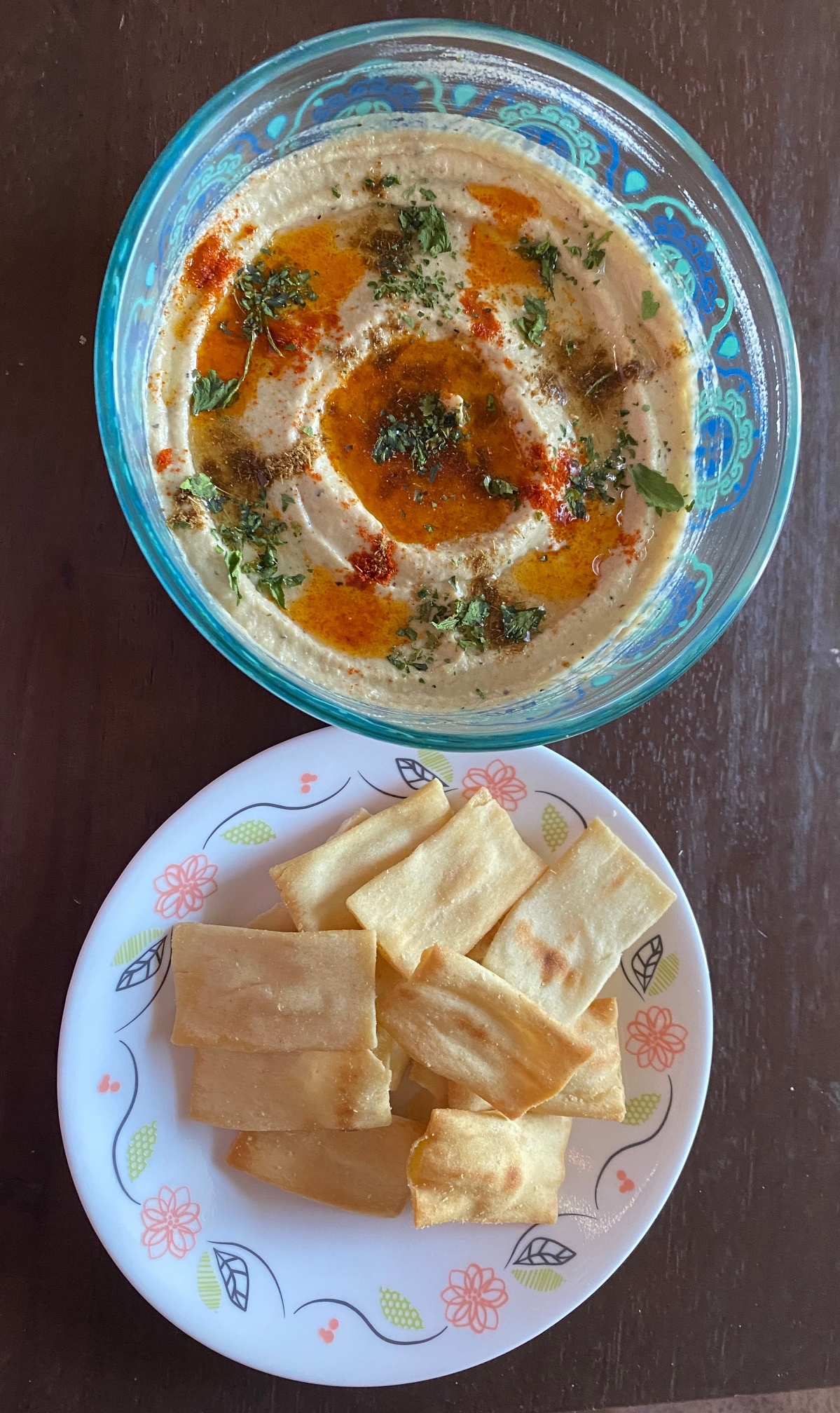 - Garnish prepared baba ghanoush with olive oil, red chili powder, cumin powder and parsley. Eat baba ghanoush with pita chips