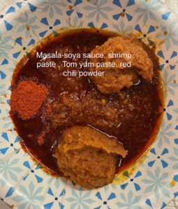 - Thai spices: Soya sauce, Shrimp paste, Tom yum paste, Red chili powder.