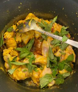 - Take the lid off and add half of the Thai basil to it and let it cook for 1 minute.