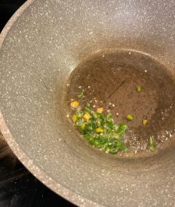 - Take a wok, put it on medium high heat. Add tablespoon of oil, let heat oil. Add garlic, Thai chili and eggplant and fry on medium heat for 2 minutes.