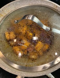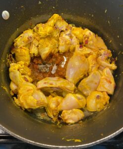 - Take a pot, put it on medium heat. Add oil, let the oil heat, add ginger garlic paste, add chicken, add tablespoon of Thai spices and let it cook for 15 minutes.