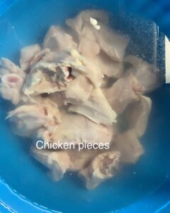 - Take a pot, add chicken pieces and wash with water and keep aside.